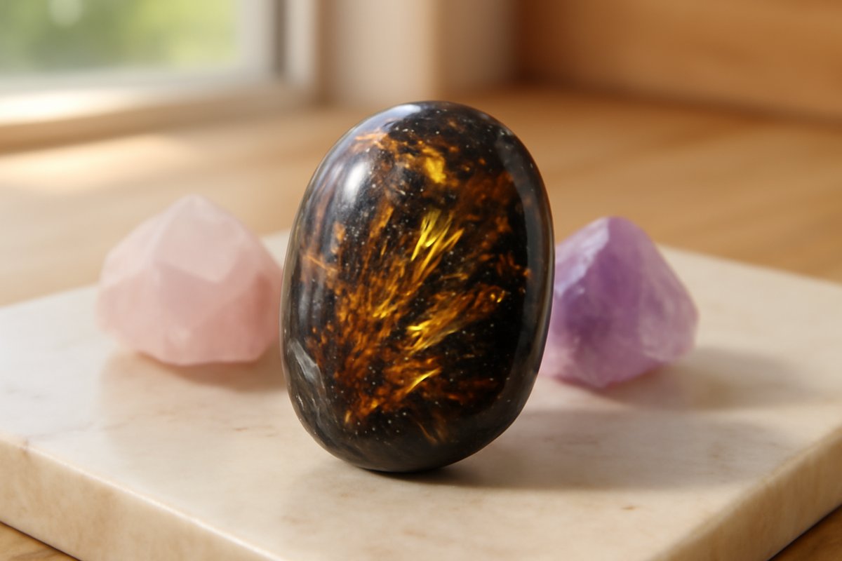 Astrophyllite accompagne l’apaisement, la transformation et l’introspection, mais nécessite prudence avec d’autres pierres et une purification douce pour préserver ses vertus.