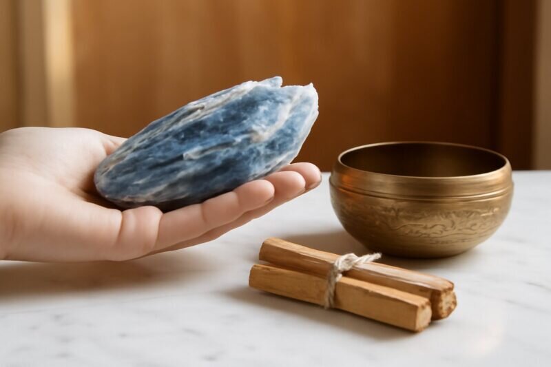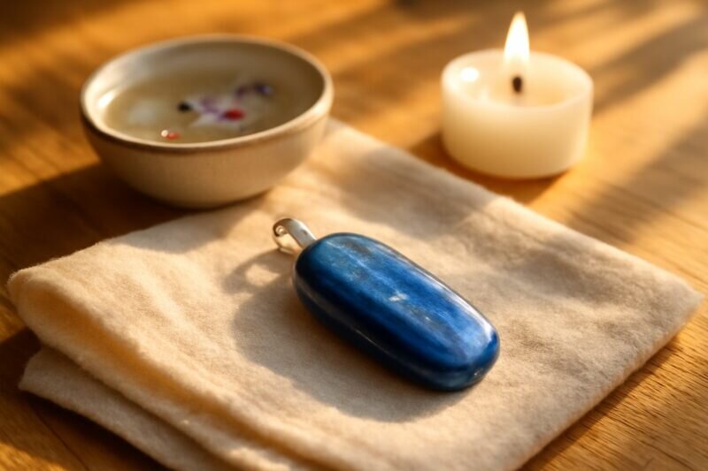 Pour nettoyer un bijou en Disthène, évitez l’eau et les produits chimiques. Préférez un chiffon doux légèrement humidifié ou une fumigation douce avec de la sauge ou du palo santo. Cette méthode respecte la fragilité du cristal tout en éliminant les énergies négatives.